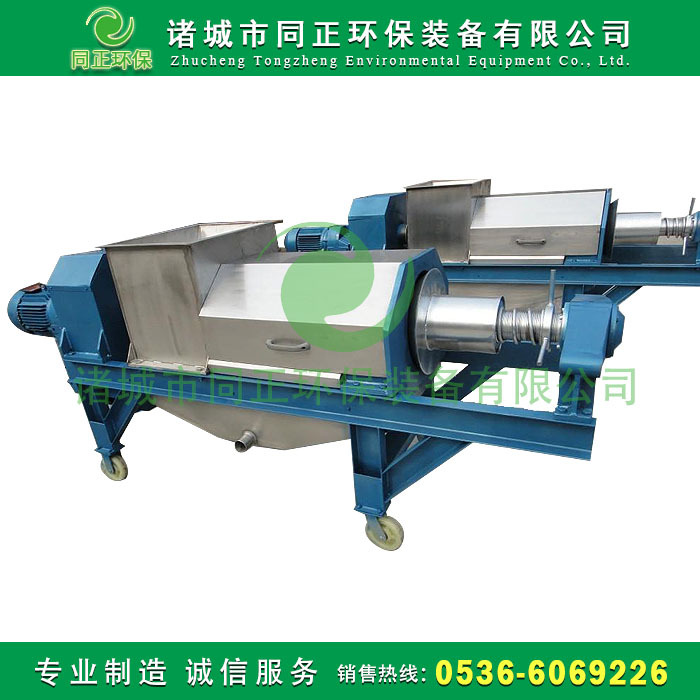 本果蔬壓榨脫水機工作過程是:輸送螺旋將進入料箱的物料推向壓榨螺旋,通過壓榨螺旋的螺距減小和軸徑增大,并在篩壁和錐形體阻力的作用下,使物料所含的液體物(果汁)被擠壓出.擠出的液體從篩孔中流出,集中在接汁斗內.壓榨后的果渣,經篩筒末端與錐形體之間排出機外,錐形體后部裝有彈簧,通過調節彈簧的預緊力和位置,可改變排阻力和出渣口的大小,用來調節壓榨的干濕程度. 5、10、20噸/時壓榨機為雙螺旋轉,旋轉方向相反,對物料的壓榨力大而均勻,出渣口錐形體由液壓缸控制,調節油壓可改變對物料的施壓效果,調整出汁率,本機還可用于其它物料的固液分離,其效果因物料品質不同有一定的差別。本機的進料箱和篩筒及螺旋均采用優質耐酸堿304不銹鋼材料制造。