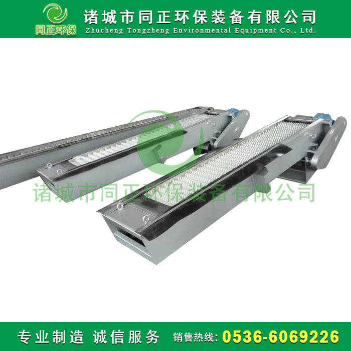 耙齒鏈運轉到設備的上部時,由于槽輪和彎軌的導向,使每組耙齒之間產生相對自清運動,絕大部分固體物質靠重力落下。另一部分則依靠清掃器的反向運動把粘在耙齒上的雜物清掃干凈。